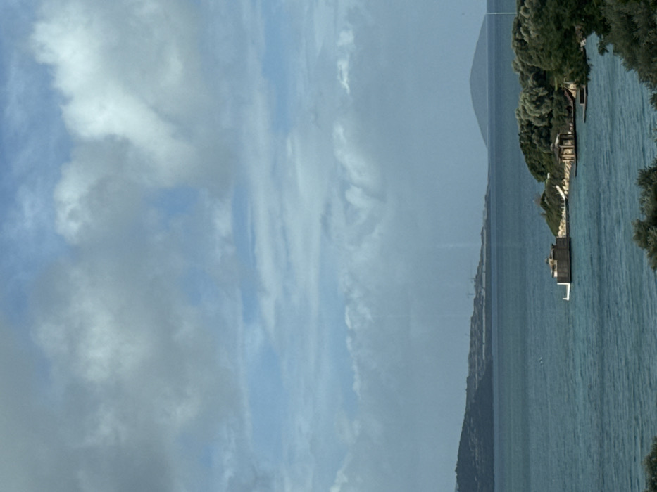 The image presents a detailed view of a coastal area located within Bodrum, Turkey, under a partly cloudy sky. The upper third of the frame consists of a sky with scattered white and grey cumulus and stratocumulus clouds, interspersed with patches of light blue. The central and lower portions of the frame are dominated by a calm, turquoise-blue body of water, indicative of a bay or the Aegean Sea. In the mid-ground, on the right side, a verdant landmass, likely a small peninsula or island, is densely covered with dark green Mediterranean trees, including prominent olive trees. Along its immediate shoreline, several structures are visible: a light-colored, square, multi-level building with a dark, possibly tiled, roof, constructed partially over the water and connected to a short, L-shaped wooden pier or platform. Further to the right, a separate wooden, open-sided gazebo-like structure with a dark roof stands on another wooden pier extending into the water. Multiple smaller wooden platforms or jetties also project from the vegetated bank into the water, and a distinct white, curved slide descends from the land towards the water's edge. To the left in the mid-distance, a darker, undulating landmass forms a more distant shoreline. Faint details along its coast suggest ongoing construction or development, including visible vertical structures resembling cranes. In the far background, positioned on the right side, a distinct, dark, conical island or hill rises directly from the water. No human figures are discernible within the frame.