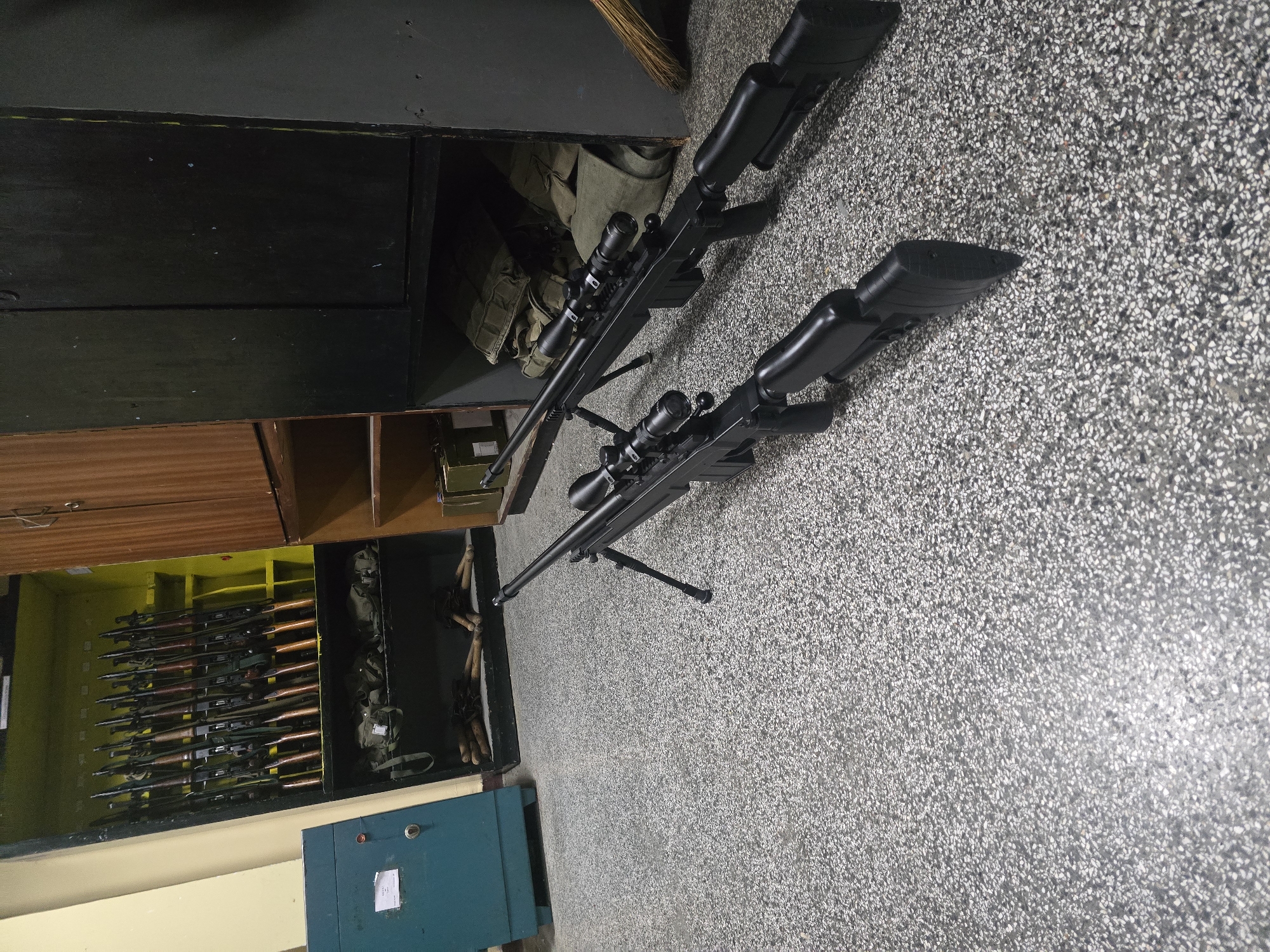 two black sniper rifles lying on a speckled gray floor, next to a partially open wooden cabinet. Inside the cabinet, rifles with wooden stocks are visible in the lower section, while military-style bags are stored in the upper section. The location is likely a storage room or armory.