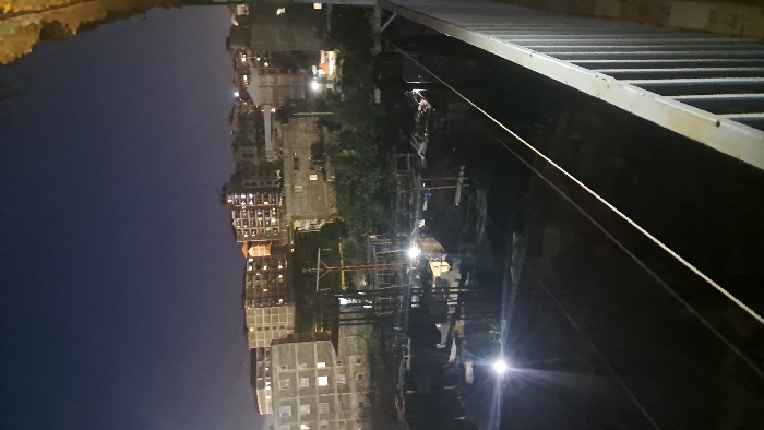 The image displays an elevated nocturnal view of an urban landscape in Nairobi, Kenya. In the immediate foreground on the right, a light-colored, possibly metallic, balcony railing with vertical balusters is visible, with a dark, textured overhang partially obscuring the upper right corner. The mid-ground encompasses a dark, expansive area indicative of active construction or an undeveloped plot. This zone is intermittently illuminated by several intensely bright, circular artificial light sources, generating prominent lens flares. Numerous skeletal structural elements, including vertical supports and horizontal beams consistent with scaffolding or unfinished building frameworks, are present. Dark horizontal lines, identified as overhead cables or wires, traverse this section. Portions of the ground appear dark and reflective, suggesting wet or muddy conditions. Scattered patches of green vegetation are distributed within this mid-ground area. The background features a dense collection of multi-story buildings, varying in height and design, characteristic of a residential or mixed-use urban district. Numerous windows in these structures are illuminated, indicating occupancy. The sky above is dark blue-black, consistent with nighttime conditions. No human figures are visible within the scene.