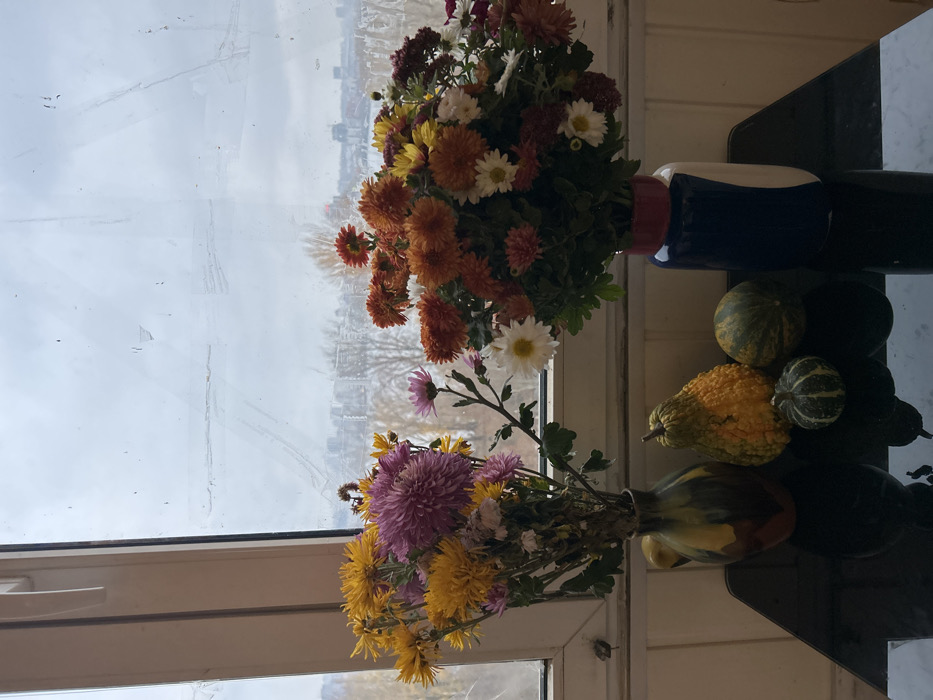 The image depicts an indoor scene viewed through a window, set in the city of Unknown, Unknown. In the foreground, a black, reflective table supports a still life arrangement. On the left, a mottled ceramic vase in shades of green, yellow, and brown holds a bouquet of yellow and purple chrysanthemums, with some blooms showing signs of wilting. To the right of this vase, three decorative gourds are arranged: a large, warty, pear-shaped yellow gourd; a medium-sized, striped dark green gourd; and a small, striped dark green gourd. Further to the right, a multi-colored vase with a blue base, white body, and red top rim contains a dense bouquet of orange, red, yellow, and white chrysanthemums. Behind these objects, a white PVC window frame is visible. The window glass exhibits numerous smudges and residues, possibly from adhesive tape. Beyond the window, an urban landscape unfolds under an overcast, grey sky. The mid-ground reveals a treeline of mostly bare deciduous trees with some reddish autumnal foliage, suggesting an autumn or early winter season. Distant buildings forming a city skyline are visible on the horizon. No individuals are present in the scene.