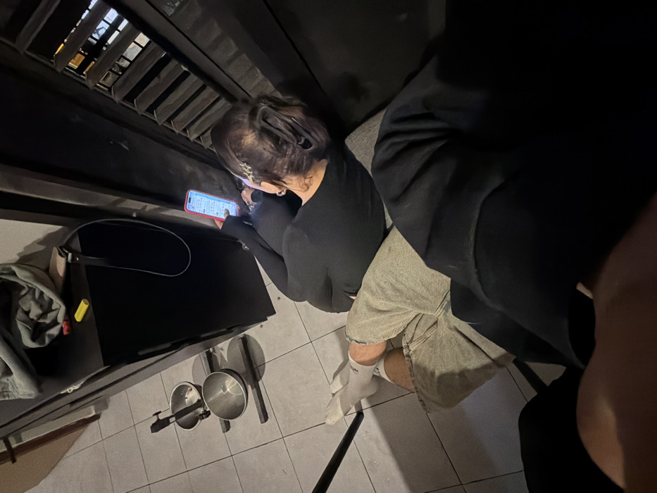 The image depicts an indoor setting with two individuals in low light. In the foreground, the lower body of one person is partially visible, wearing dark clothing and light-colored shorts. A second individual, a female, is seated on the floor or a low cushion, viewed from a slightly elevated rear angle. She has dark hair secured with a large claw clip and multiple small star-shaped barrettes. She wears a long-sleeved black top, grey distressed shorts, and white socks. She is actively engaged with a glowing smartphone, held in both hands, displaying a messaging application on its screen. A small object, possibly a vaping device, is held near her mouth, with a faint wisp of vapor. To the left, on a light-tiled floor, a black stand holds two stainless steel pet bowls, one containing liquid. Adjacent to the seated individual is a dark, tall cabinet or storage unit. On its top surface are a crumpled grey garment, a brown bag strap, and a yellow lighter. To the right, a dark structure with horizontal slats, possibly louvers or a ventilation unit, is visible. The scene is generally dim, with the smartphone screen being a prominent light source. There are no discernible elements within the image to identify its specific location in the city of Haifa, Israel.