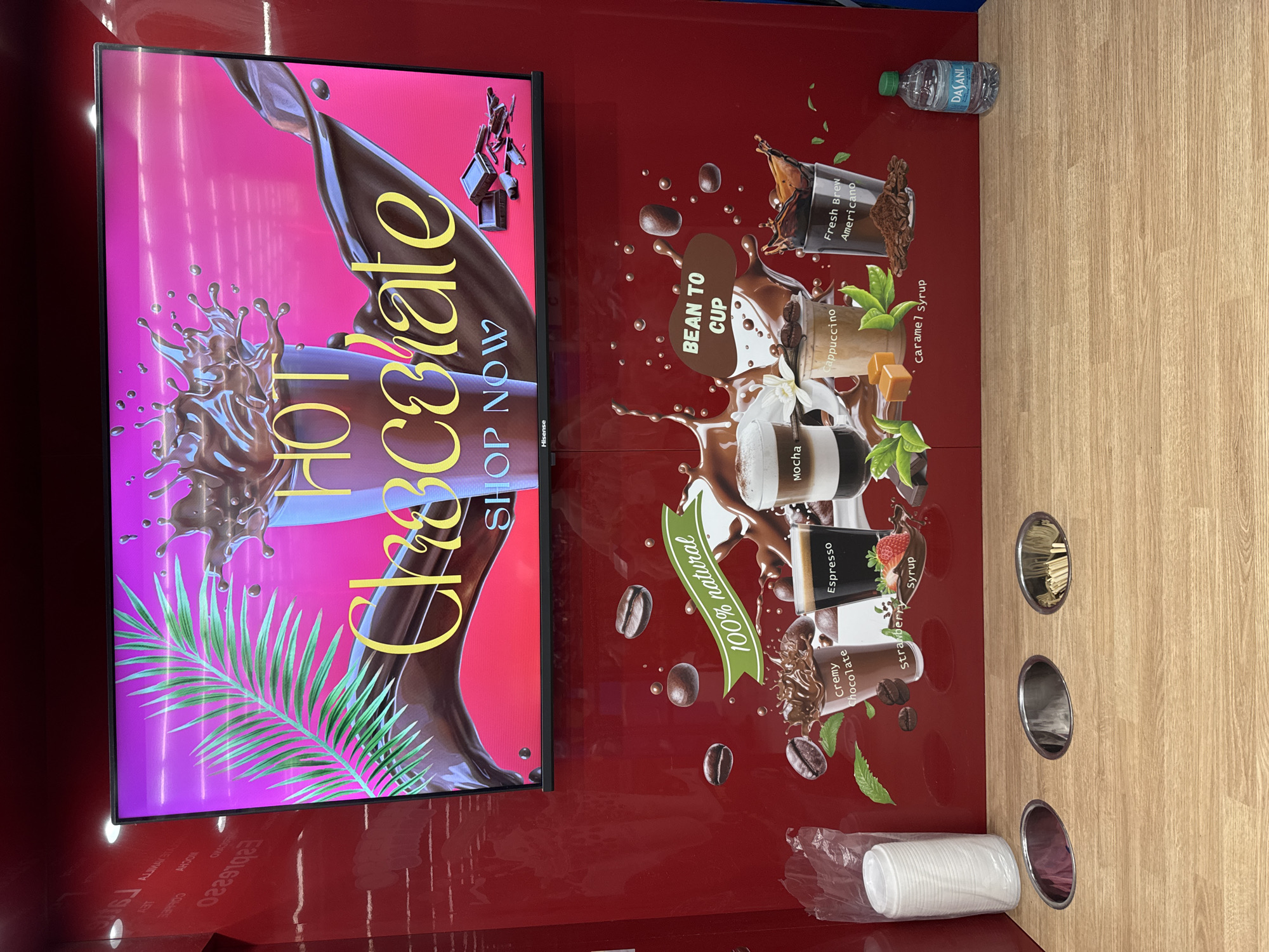 coffee vending machine, likely located in Vaughan, Canada. The machine has a digital display advertising hot chocolate, with an image of chocolate being poured. Adjacent to the display is a panel with images of different coffee drinks (espresso, mocha, cappuccino, americano) and the words "bean to cup" and "100% natural." There are nozzles and areas to dispense the drinks and a slot containing stacked paper cups, as well as a water bottle on top of the machine.