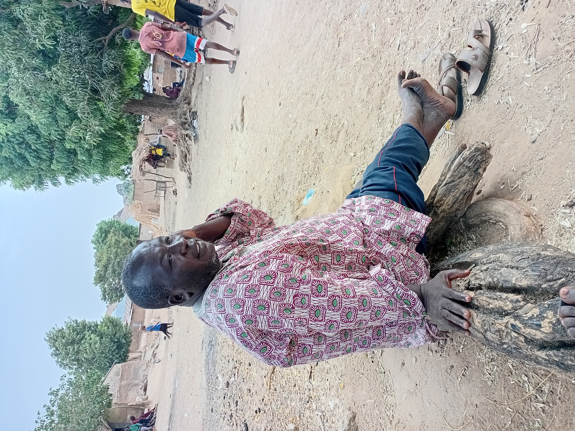 n adult man lying on a weathered log outdoors in what appears to be a rural area in Nata-Ala, Nigeria. He is wearing a patterned shirt, dark blue pants with a red stripe, and is barefoot. His sandals are placed next to his feet on the sandy ground. The man's head is turned slightly, and his hand is near his head as if he is resting. In the background, there are several people and structures that suggest a village setting. A group of children are walking down a path, and beyond them are simple buildings constructed of mud or similar materials. Trees are scattered throughout the scene. The ground is dry and sandy, consistent with a rural environment.