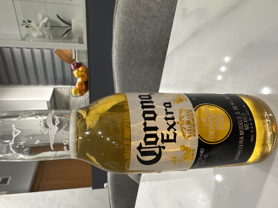 The scene is set indoors in a modern kitchen or dining area in Zhiten, Bulgaria. A partially consumed 355ml (12 fl. oz.) bottle of Corona Extra beer, with a lemon wedge inside, stands prominently on a glossy white tabletop with subtle grey veining. Residue of foam is visible on the interior neck of the clear glass bottle. To the right of the bottle, the top of a grey upholstered dining chair is visible. The background reveals a contemporary interior featuring a dark grey lower wall or counter segment, topped by white upper cabinets. A window with horizontal blinds is visible behind the counter. On the counter, a woven or metal fruit bowl holds an assortment of fruits including oranges, lemons, and apples. Further right, a clear glass display cabinet contains a potted white artificial orchid. No individuals or active interactions are present in the static image.