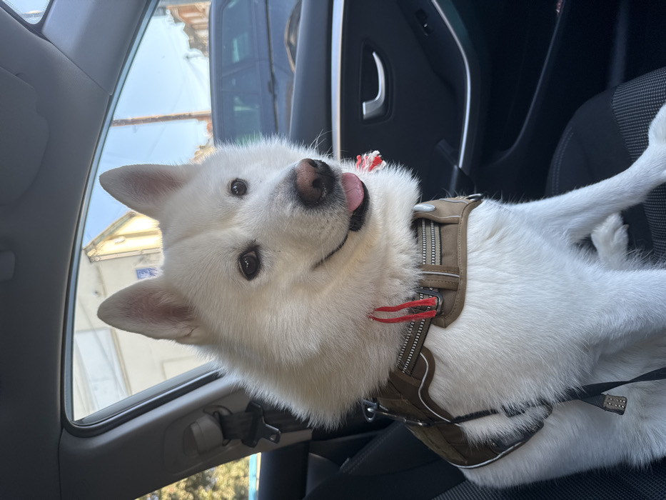 - "A white, dense-furred dog, resembling a husky, is seated upright in the front passenger seat of a vehicle" by FM-LfMXD2, licensed under CC BY 4.0