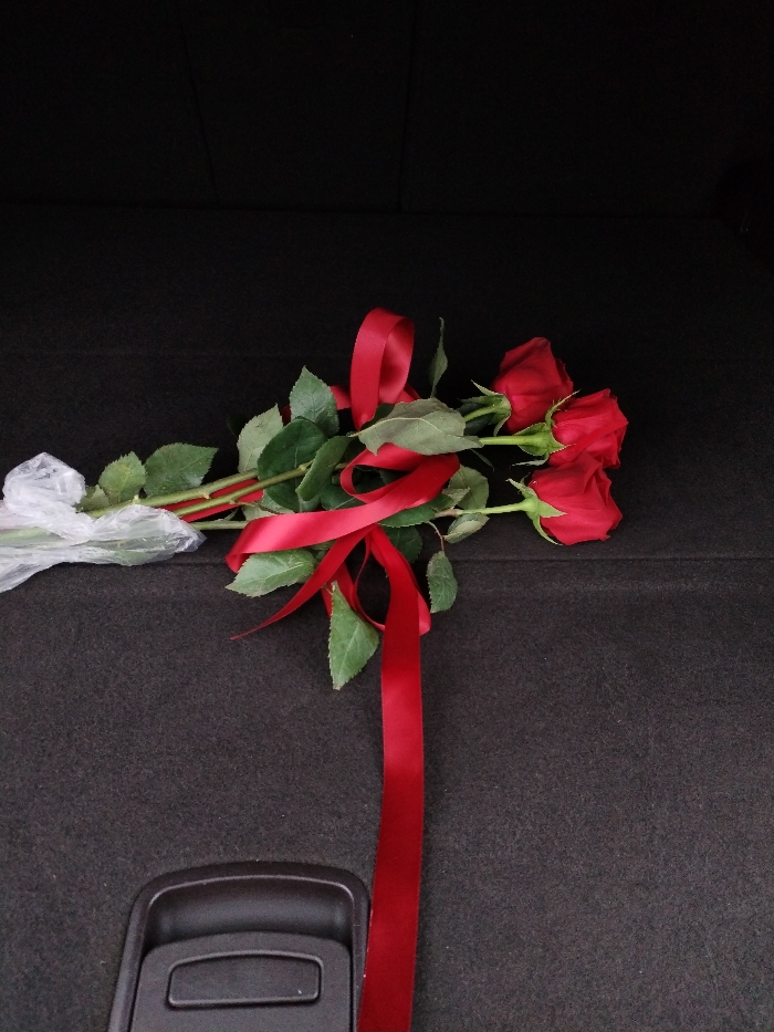- "Three red roses, featuring green stems and leaves, are laid horizontally on a dark, textured carpet surface within what appears to be a vehicle's cargo compartment" by FM-Wjo1E2, licensed under CC BY 4.0