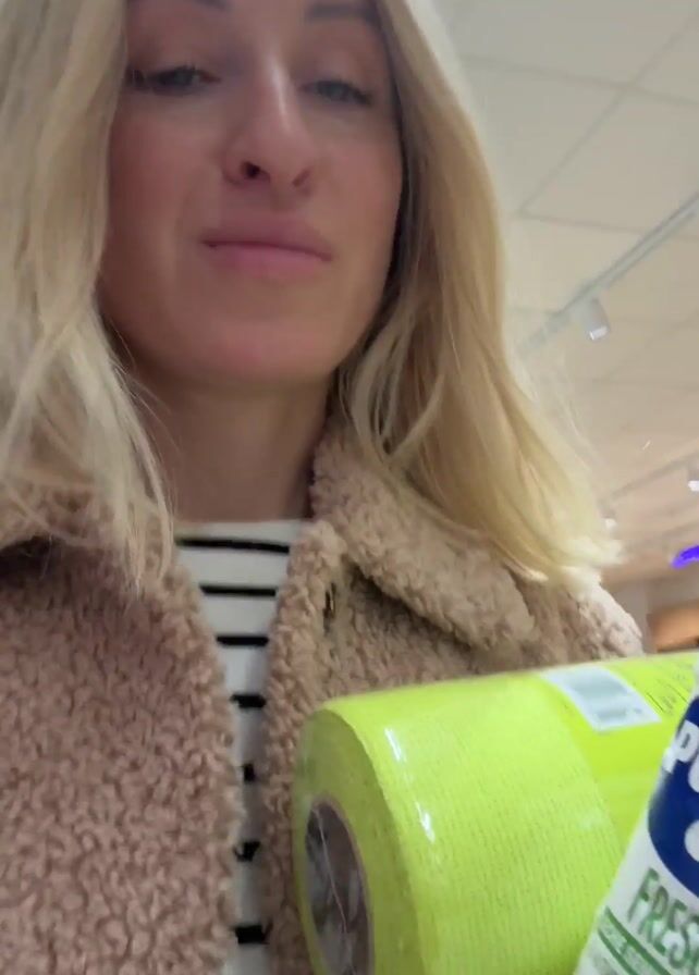 A woman is in a supermarket. She is holding a roll of green paper towels and a bottle of milk labeled “Puleva Fresca.” She is wearing a tan teddy bear jacket over a black and white striped shirt. She looks at the camera and smiles slightly. In the background are produce shelves and another person wearing a white hat and apron.