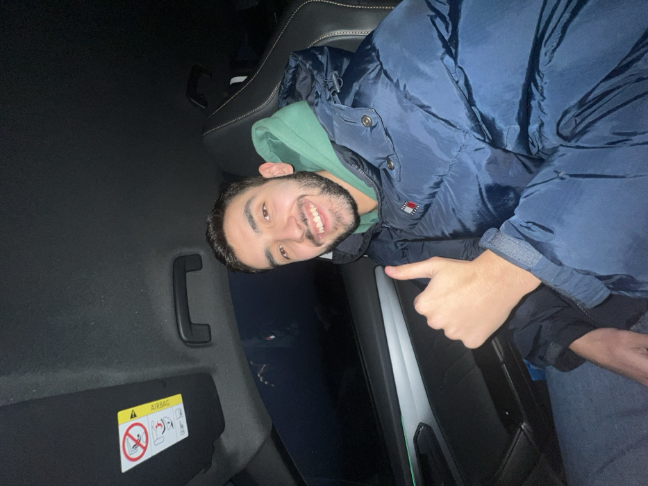 A person smiles and gives a thumbs-up while sitting in a car. The individual wears a green hoodie and a navy blue puffer jacket with a Tommy Hilfiger logo. An airbag warning sign is visible on the car's sun visor, with a grab handle on the ceiling nearby. The car seat and door are partially visible, and it appears to be nighttime outside.