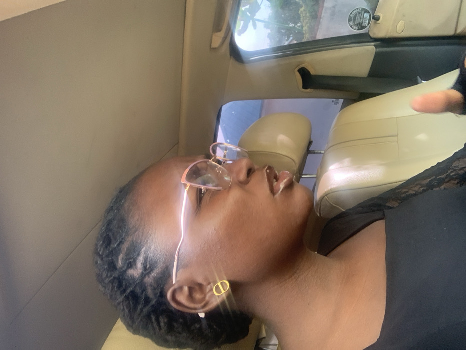 A single adult female is depicted in profile, seated within a vehicle in the city of Gombe, Nigeria. She has dark skin, dark hair styled in dreadlocks, and wears large, rose gold-framed eyeglasses. Gold-colored stud earrings, shaped as a stylized "CD" logo, are visible on her left ear. Her mouth is slightly agape, and a white substance is present around her lips. She is wearing a black top with a lace pattern visible on the right sleeve. The vehicle's interior features a light-colored headliner and beige or tan upholstery on the seats and headrest. Through the open window on the right, green foliage and a section of a building or wall are visible, indicating an outdoor setting under daylight. Her right hand is partially visible in the lower right, with the thumb extended upward.