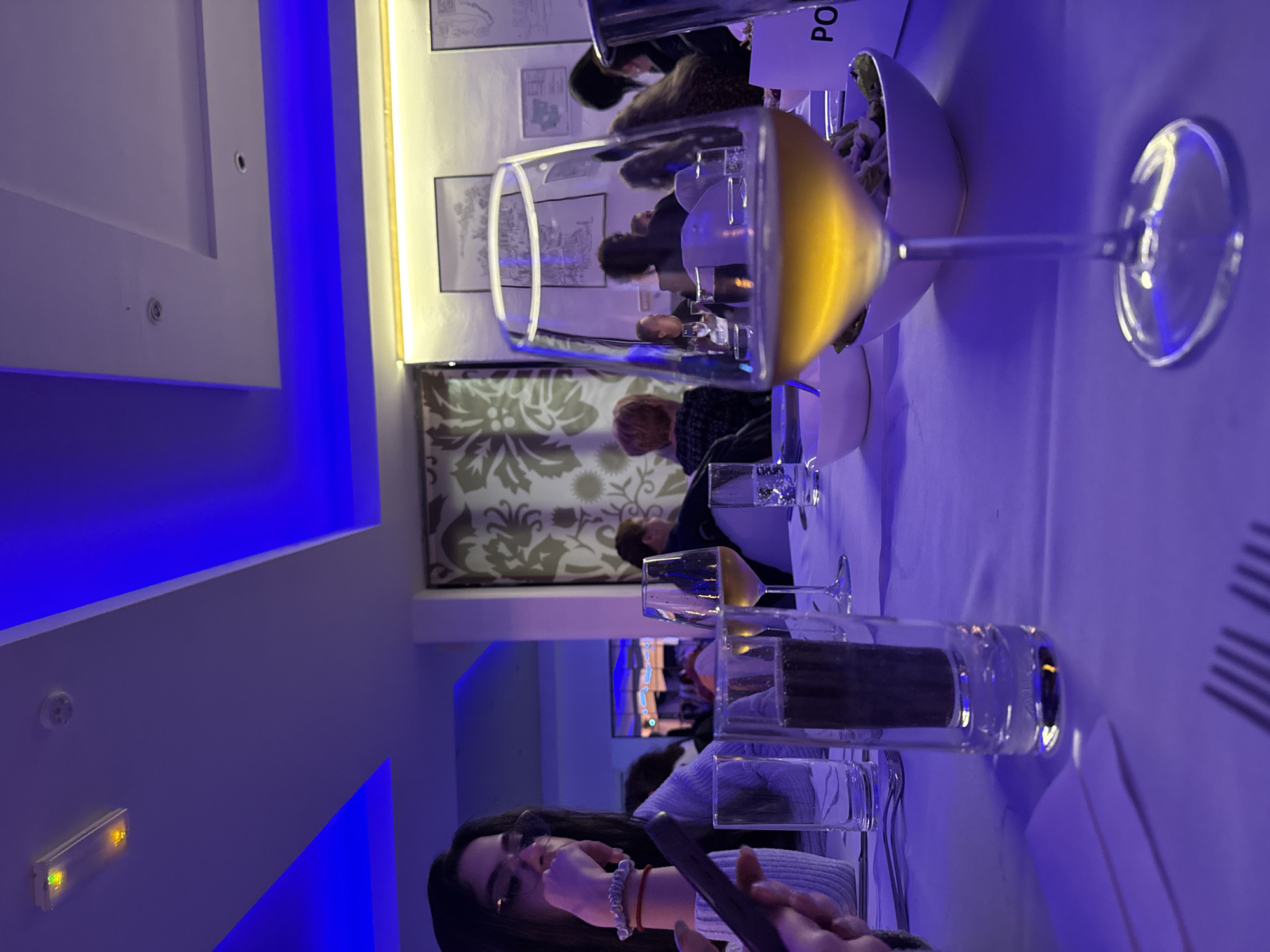 The image depicts a restaurant scene, likely in Cukarica Urban Municipality, Serbia. A woman with glasses and a light blue sweater is seated at a table, holding a smartphone. The table is set with white tablecloths, multiple glasses (some filled with water or other beverages), cutlery, and a white bowl containing a salad. A wine glass filled with a golden liquid is prominently featured. Behind the woman and the foreground objects, other people are seated at tables. The restaurant’s interior includes walls with decorative patterns and framed pictures. The lighting is a mix of warm yellow and blue LED accents. The perspective is somewhat tilted, suggesting the photo was taken at an angle.