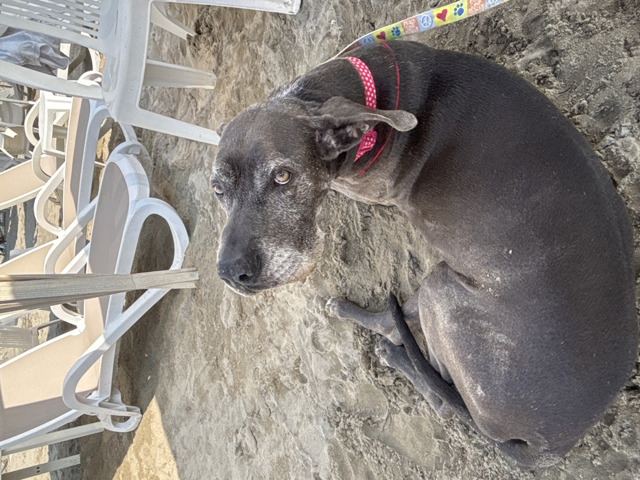 - "A grey dog with a pink collar rests on sand near white plastic chairs" by FM-hF3gy1, licensed under CC BY 4.0