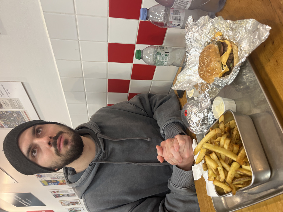 - "male individual seated at a wooden table within a Five Guys restaurant in Lille, France" by FM-2aYl13, licensed under CC BY 4.0