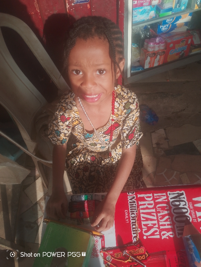 A young girl with braided hair and a patterned dress stands behind a table filled with various items, including candies and a red and white advertisement for "N600M in Cash & Prizes!" and 2 Millionaire Daily