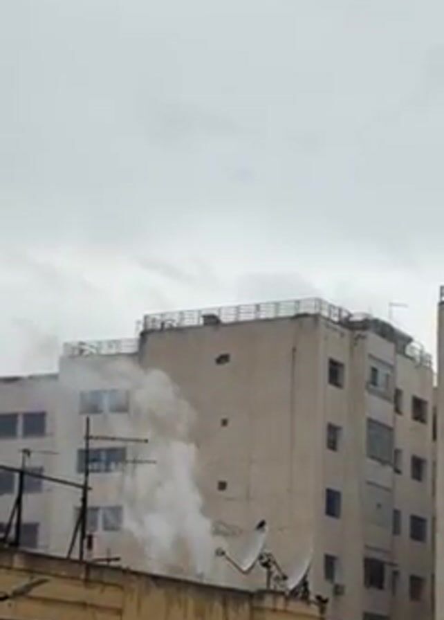 plumes of white smoke rising between buildings in an urban setting. The buildings are light-colored and appear to be several stories high. Satellite dishes are visible on the roof of the building closest to the viewer. The sky is overcast and gray. There is no visible activity on the ground.