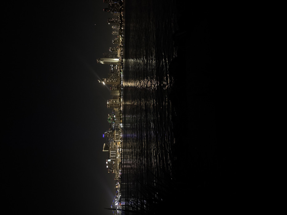 The image displays a nocturnal panorama of the San Diego city skyline, observed from a vantage point within Coronado, United States of America, looking eastward across San Diego Bay. The lower third of the frame is occupied by dark, undifferentiated terrain, with faint, dark outlines suggesting vegetation on the far left. Above this, the dark surface of San Diego Bay spans approximately one-fifth of the image's height, featuring numerous elongated, shimmering reflections of city lights, indicative of ripples on the water. The central background is dominated by the illuminated San Diego skyline, comprising numerous high-rise buildings and skyscrapers. These structures exhibit a variety of architectural lighting, primarily in white and yellow hues. Notable specific illuminations include distinct blue lighting on a building to the left of the skyline's center and a prominent, upward-projecting light beam emanating from a tall structure towards the right-center. A segment of the Coronado Bridge, characterized by blue accent lighting, is partially visible on the far left edge of the skyline. The upper half of the image is a featureless, dark night sky. No individuals, specific actions, or direct interactions are discernible within the scene. The environment is an urban waterscape presented under dark, clear night conditions.