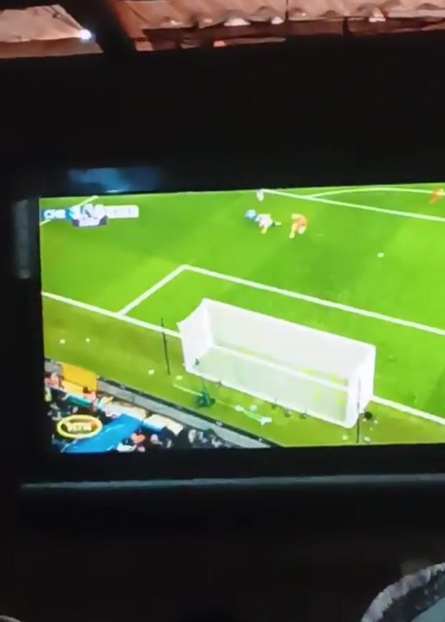 Here's a brief description of the video: The video shows a TV screen displaying a soccer match. The camera angle is from below and slightly to the side, suggesting the person recording is in front of the TV. The video captures the gameplay, including players running, tackling, and passing the ball. The recording location seems to be outdoors under a roof of corrugated metal sheets. Parts of some people, presumably watching the game, are also visible in the foreground.