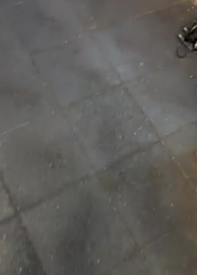 person's foot wearing a bright green and purple sneaker on a dark gray, textured floor with square tiles. The camera is positioned looking down at the foot and the floor. A hand with a gold bracelet appears, making the "okay" sign. The hand has a visible scratch on the skin near the wrist. The background shows a glimpse of a purple wall and a dark, possibly black, object to the right.