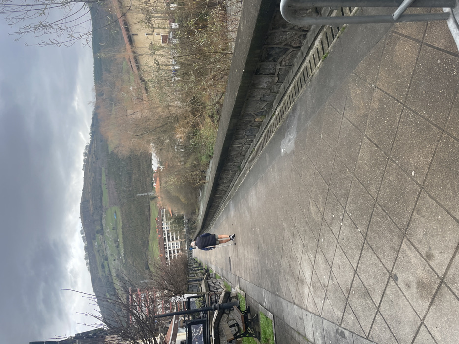 The image depicts an overcast daytime scene on a paved walkway in Azpeitia, Spain. An adult male, viewed from behind, walks away from the camera down the center of the grey, tiled path. He wears a dark puffer vest, light-colored shorts, and dark shoes, and uses a white cane as a walking aid in his right hand. To the left of the walkway, there is a grassy strip with dark slatted benches, black ornamental streetlights, and leafless trees. Further left, multi-story buildings are visible. To the right, a stone wall with a concrete top separates the walkway from a river flowing downstream. The riverbank is lined with bare trees and shrubs. In the mid-ground, across the river, are additional buildings, including an older, light-colored structure with an orange-tiled roof on the far right. The background is dominated by a large, green hillside or mountain, partially forested with areas of open land and visible power line infrastructure, beneath a cloudy sky. A metallic U-shaped barrier is partially visible in the immediate bottom right foreground.