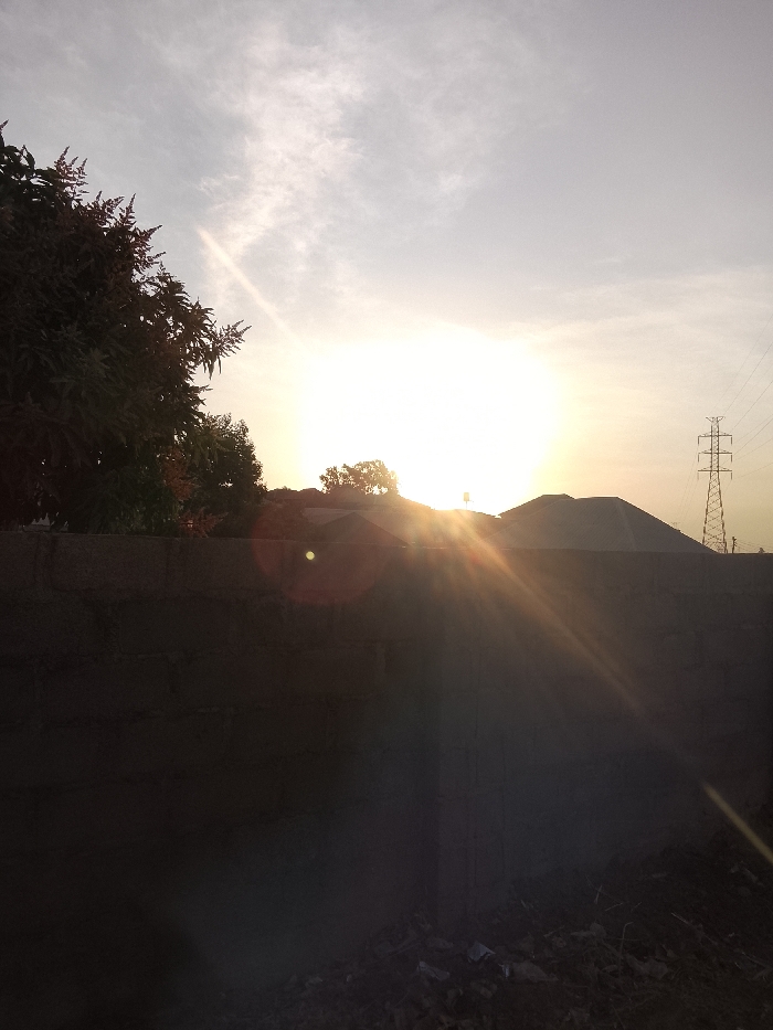 A high wall obscures the lower portion of a sun-drenched scene. The bright sun casts rays across the image. To the left, tree foliage extends from behind the wall. The silhouettes of rooftops are visible atop the wall, with a power transmission tower in the distance. The ground in front of the wall is dark, strewn with debris. The sky fades from white to pale blue, with thin clouds adding texture.