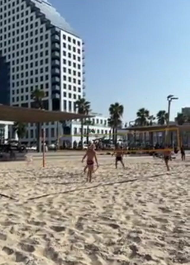 beach volleyball game being played on a sandy beach on a clear, sunny day. There are at least six people visible, divided into two teams on either side of a volleyball net. They are wearing casual beach attire, including swimwear and shorts. The players are actively engaged in a volley, moving around to position themselves and hit the ball. In the background, there's a modern, high-rise building with a unique, geometric design, and palm trees dotting the landscape. There are also shaded areas with people relaxing, suggesting it's a public beach. The overall impression is a pleasant, active scene on a sunny beach.