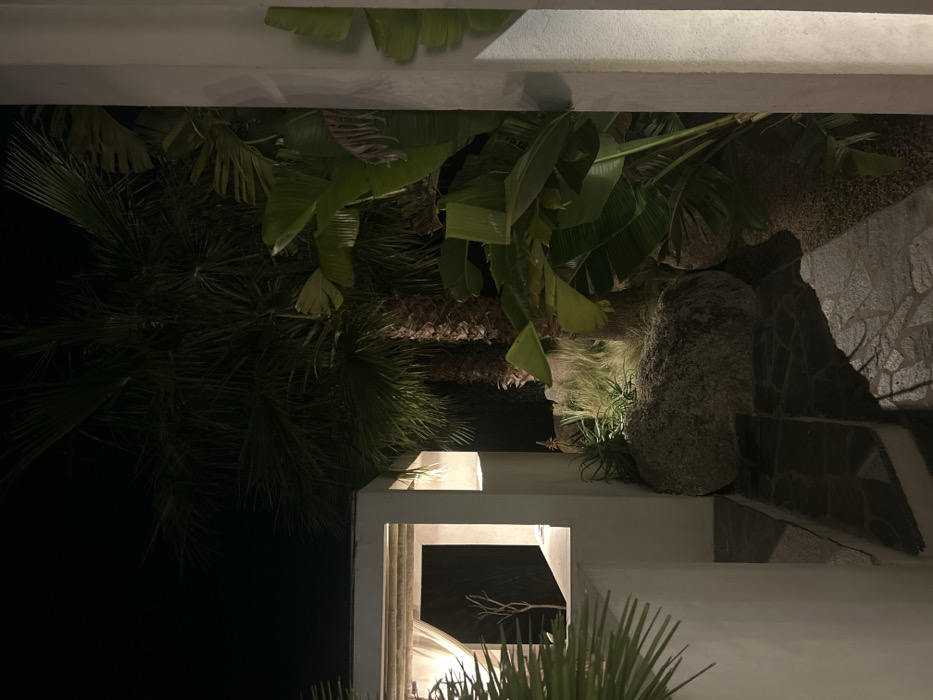 This night-time image depicts an outdoor landscaped area in Zonza, France. The scene is dominated by white stucco architectural structures and dense vegetation, illuminated by artificial light against a dark sky. On the left, a recessed patio or pergola opening features a light-colored, possibly slatted wooden ceiling and a partially drawn sheer white curtain. Beyond the curtain, a dark background reveals a decorative, bare tree branch. Adjacent to this structure, a garden bed contains multiple large palm trees and broad-leafed plants, resembling banana plants or Strelitzia nicolai, illuminated by ground-level up-lighting. Smaller succulent plants, including aloe, and ornamental grasses are visible at the base of the larger flora. Several large, rounded grey rocks are integrated into the landscaping. The ground consists of irregular dark stone pavers forming a pathway and a visible step, leading downward towards the foreground. Sections of gravel or small stones are present in the garden beds. A vertical white pillar or wall edge is visible on the far right of the frame, also illuminated. No individuals are present in the scene.