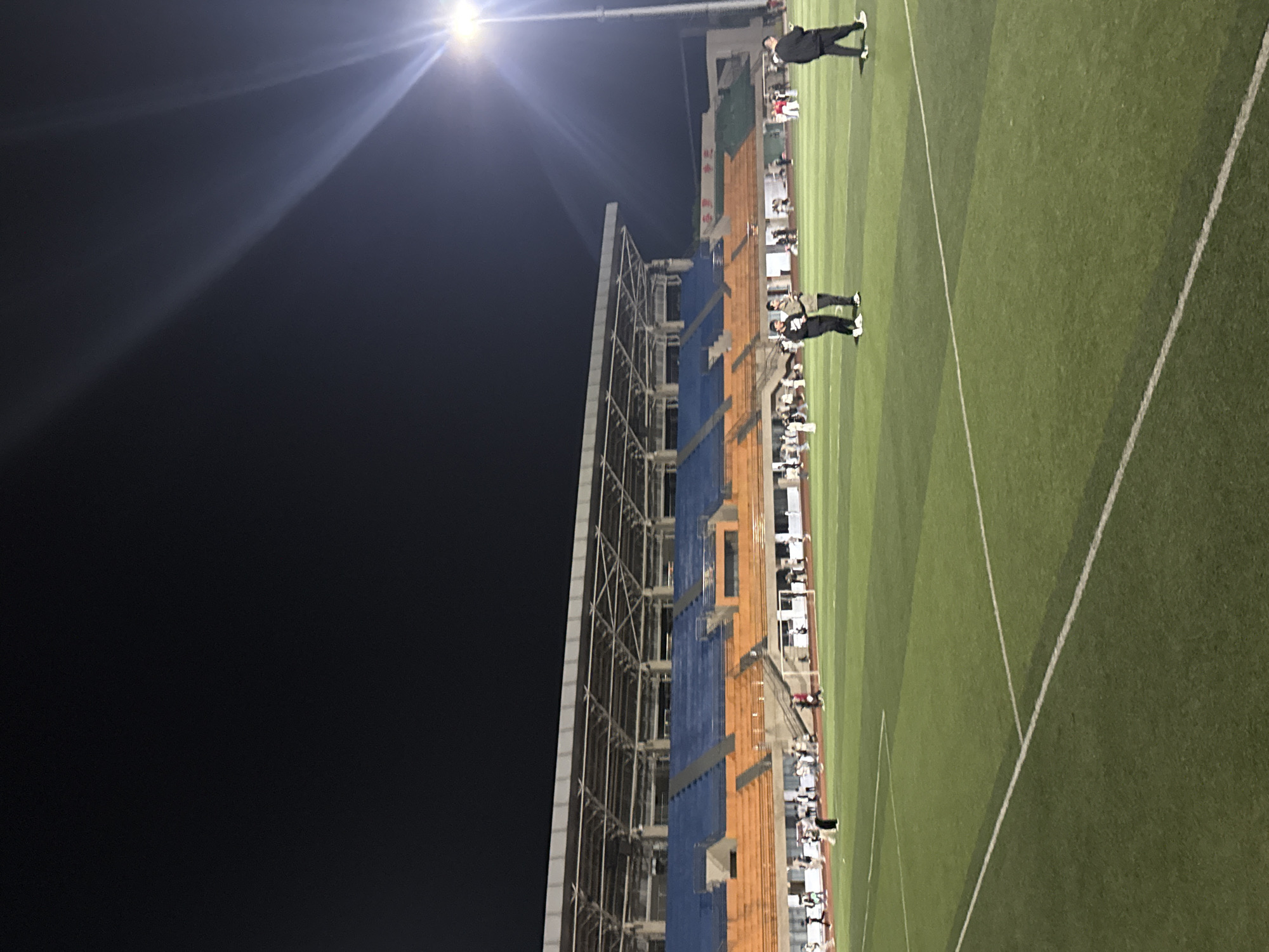 The image depicts an outdoor nighttime scene at a stadium in Jiangjin, China. A brightly lit field is visible with white lines demarcating its boundaries. Two individuals stand on the field, wearing what appears to be athletic attire. Spectator seating is located adjacent to the field, composed of blue and orange sections. The stadium structure is prominent, with a tall metal framework. The background is a dark night sky with a stadium light emitting a strong beam of light.