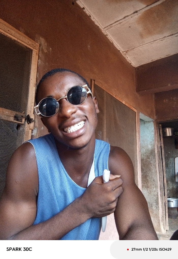 A young man wearing round sunglasses and a blue tank top smiles broadly, holding a white toothbrush in his hand. He stands indoors with a weathered wall and doorway behind him. A window with a wire mesh screen is partially visible. The lighting is uneven, casting shadows. A glimpse of a kitchen or storage area is visible through a doorway.