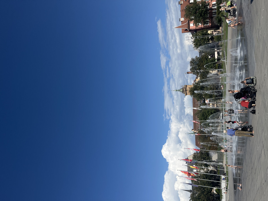 The image depicts a daytime outdoor scene at Place de l'Ancienne Douane in Colmar, France. A large, ground-level water fountain with numerous active vertical jets occupies the central area of a dark gray tiled plaza. Approximately 25-30 individuals are present; children and young adults are actively wading, playing, and running through the water jets. Several adults are situated near the fountain, observing or accompanying the children; some are standing, while others are seated or kneeling on the wet pavement. Three dark-colored baby strollers are positioned on the dry pavement immediately adjacent to the fountain. In the mid-background, a series of tall flagpoles displays various flags, including the Flag of Europe and what appears to be the municipal flag of Colmar. Directly behind the flags, the historic Koïfhus (Ancienne Douane) building is prominent, characterized by its light-colored facade, dark sloped roofs, and a distinctive octagonal tower capped with a green spire. To the right of the Koïfhus, additional multi-story traditional buildings with pitched roofs are visible, one featuring a reddish facade. Scattered green deciduous trees are interspersed behind the structures. The sky overhead is a clear, deep blue, transitioning to a lighter blue with white cumulus clouds along the horizon. The scene is illuminated by bright sunlight.