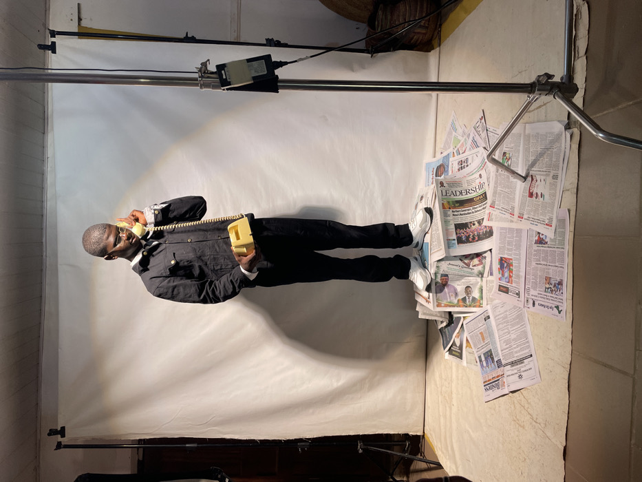 In a photography studio located in Barakin Akawo, Nigeria, a young adult male is depicted standing centrally on a scattered pile of newspapers. The male subject has dark skin, a very short haircut, and is wearing eyeglasses. He is dressed in a black denim-style jacket over a white collared shirt, black trousers, and white athletic shoes with gray accents. He holds a pale yellow vintage-style telephone handset to his right ear with his right hand, while supporting the telephone's base in his left hand. His head is slightly tilted, and his gaze is directed towards the left. The background consists of a plain white fabric seamless backdrop. Studio equipment, including a silver C-stand with attached cables, is visible on the right side of the frame, with a partial stand visible on the far left. A distinct shadow of the subject is cast onto the white backdrop behind him.