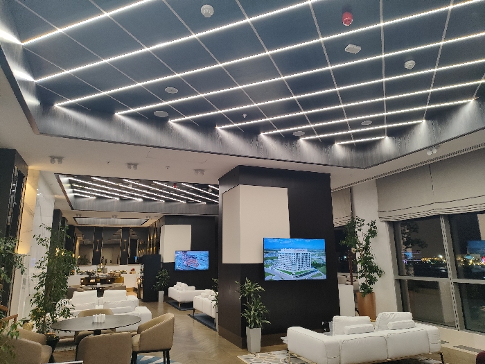The image displays a modern, unoccupied interior space, likely a lounge or lobby, located in Konigil, Uzbekistan