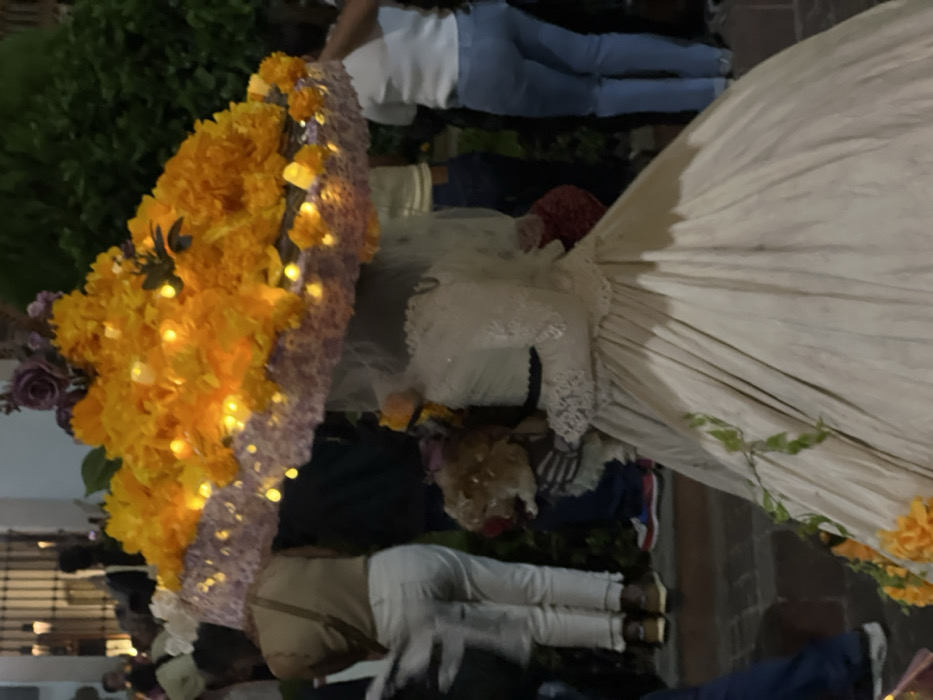 An evening scene in Guanajuato City, Mexico, depicts a central figure in an elaborate costume, viewed from a slightly elevated rear-left perspective, surrounded by a public gathering. The primary subject is adorned in a long, off-white, Victorian-style dress featuring a full skirt and lace detailing on the sleeves. A black band cinches the waist. The individual wears a wide-brimmed hat covered densely with numerous orange marigold-like flowers and illuminated by small, warm-toned LED lights along its brim. The underside of the hat's brim is light purple with additional small lights. A green vine trails down the front of the dress. The figure holds a small, fluffy, light brown dog with dark eyes in their left arm, while a small, red, textured bag is held in their right hand. The person's face is obscured by the hat and a veil. In the out-of-focus background, other individuals are present, indicating a crowd. To the left, a person wears a tan top and white pants. To the right, another person wears a white top and blue jeans. The ground is paved, and distant, dimly lit buildings with barred windows and foliage are visible, suggesting an urban outdoor setting at night.