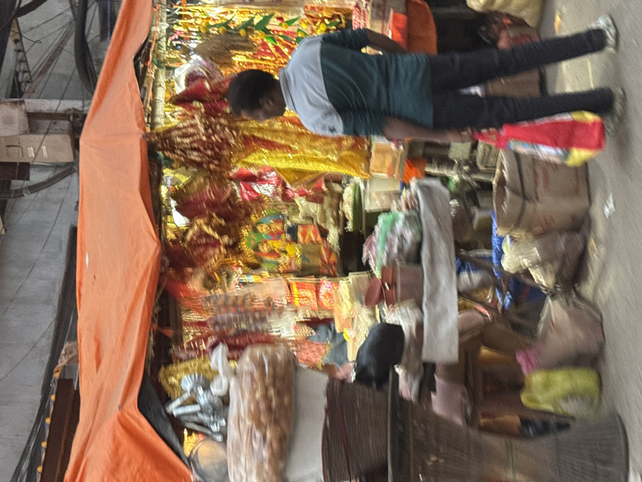 The image depicts a street market scene in the city of Howrah, India. In the foreground, a male individual is observed from behind, facing a vendor stall. He wears a two-tone long-sleeved shirt, dark trousers, and carries a red shopping bag with multi-colored patterns in his right hand. The market stall is covered by a prominent orange tarpaulin canopy. It is densely packed with merchandise, which appears somewhat blurred due to motion or focus. Central to the stall's display is a framed religious image, positioned at the rear and emitting a yellowish light. This image is surrounded by numerous sparkling gold and red decorative hangings and garlands. On the left side of the stall, a large transparent bag filled with light brown edibles or dried goods is stacked. Below this, woven baskets are visible. A black object, resembling a cat, rests on a stack of goods on a table covered with a white cloth. Various other items, including plastic containers and bundled goods, are arranged on this table. Additional boxes and bags are visible on the ground beneath the stall tables. The ground is a paved surface, and in the upper background, urban building elements with exposed utilities are present.