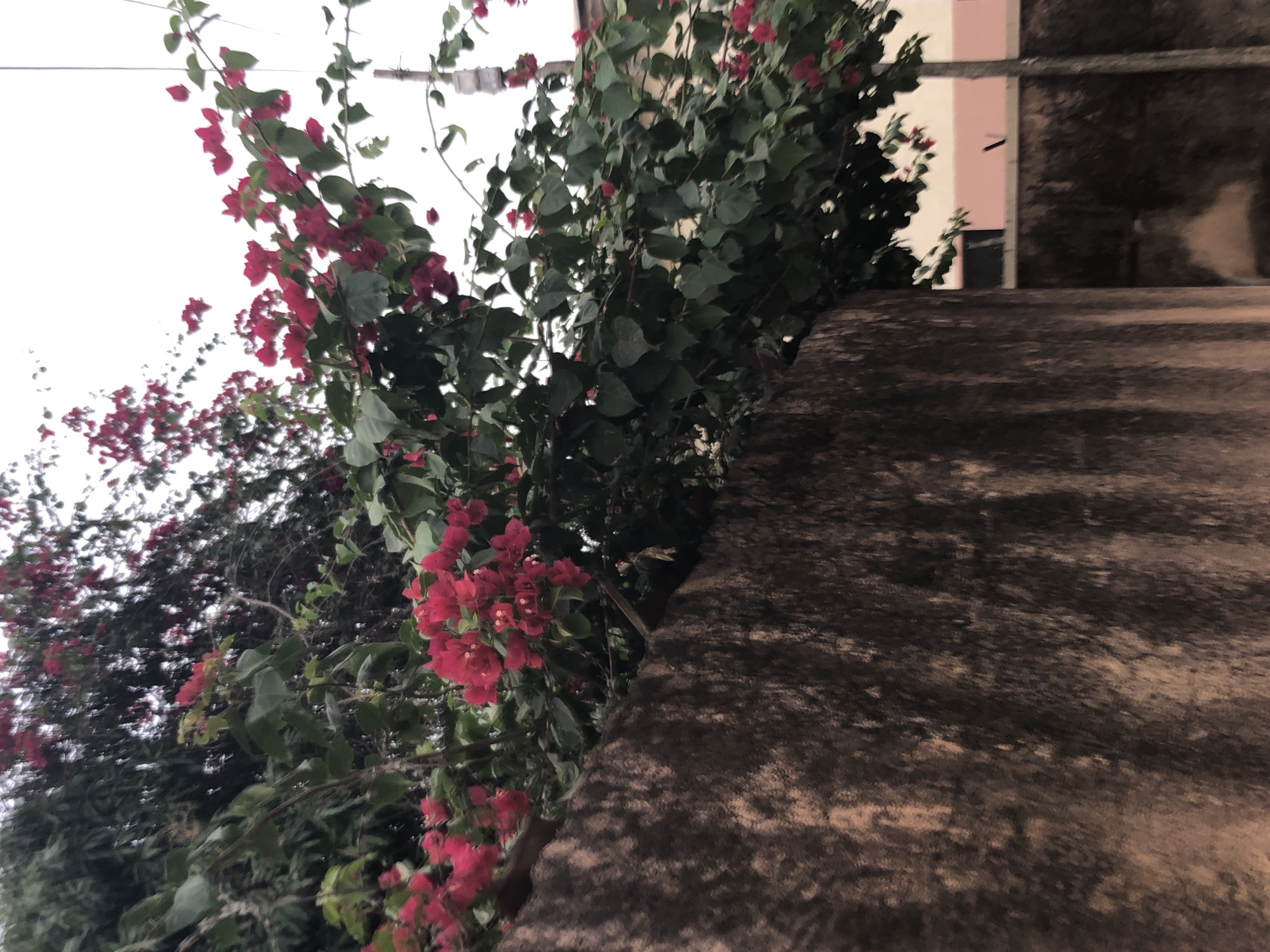 The scene in Gura Top, Nigeria, presents an exterior view dominated by a textured wall and vibrant flora. The lower left and central foreground feature a substantial wall, exhibiting a rough, discolored surface primarily dark brown with mottled lighter brown and beige patches, indicative of stucco or concrete and weathered exposure. Overtopping this wall is a dense growth of bougainvillea, characterized by numerous clusters of bright fuchsia-pink to red bracts and dark green leaves. Behind the bougainvillea and extending to the upper left, additional dark green foliage from other trees or shrubs is visible. The upper right background consists of a uniformly light grey, overcast sky. A slender, vertical utility pole or tree trunk, greyish in color, stands on the right side. Partially visible behind the vegetation on the right is a building with a light-colored, possibly pale pink or beige, exterior wall and a darker horizontal line, likely a roof edge or architectural feature. No individuals or specific actions are discernible. The lighting is diffuse, consistent with an overcast sky.