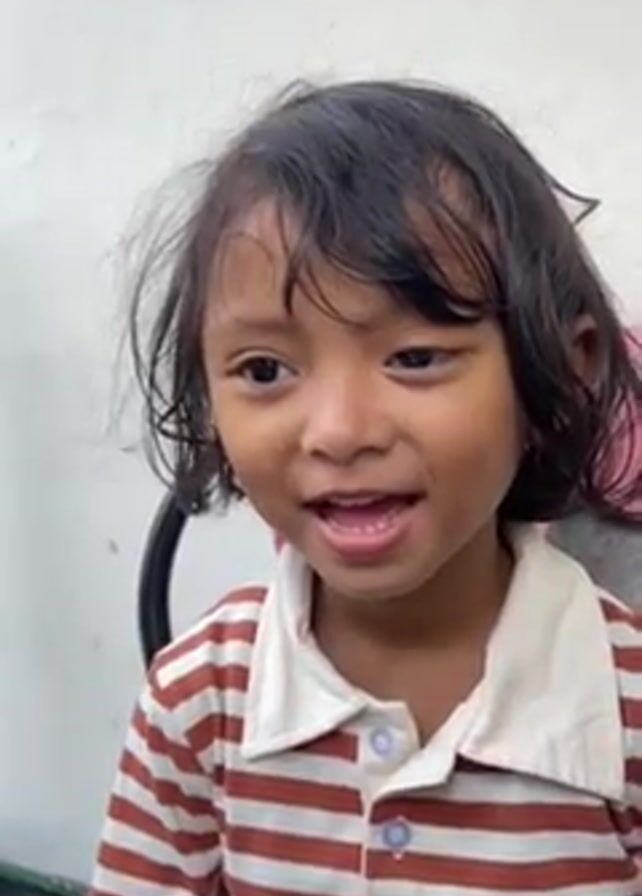 A young girl with short, dark hair, wearing a red and white striped shirt with a white collar, looks at the camera and smiles. She then opens her mouth and laughs widely. The background is a white wall.