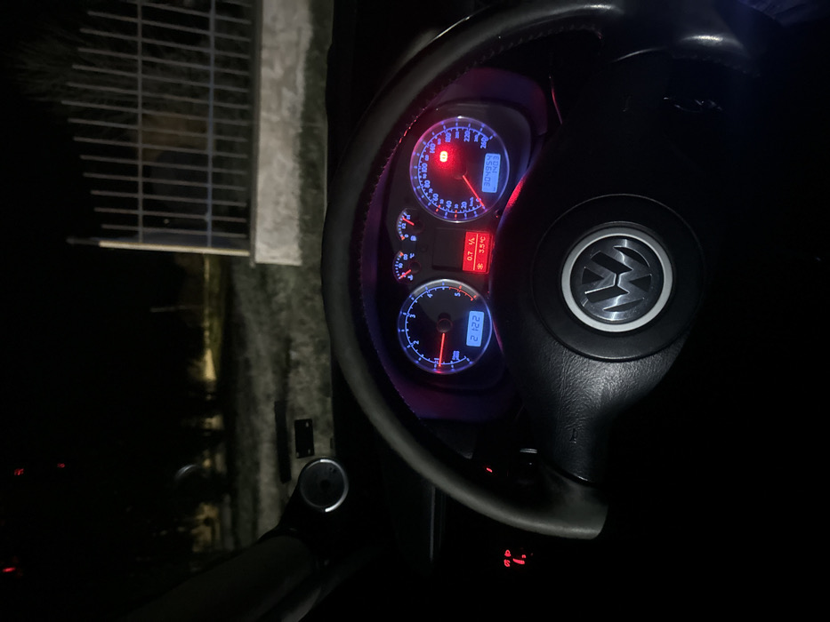 The image depicts the interior of a vehicle at night, positioned in Dolna Dikanya, Bulgaria, looking forward through the windshield. The steering wheel, bearing a central Volkswagen emblem, is prominent in the lower half of the frame. The dashboard instrument cluster is illuminated with blue and red lights. The left gauge displays "2122," while the right gauge, a speedometer, indicates 0 km/h with an active red warning light above it. A central digital display shows "0.7 l/h" and an outside temperature of "3.5 °C." A lower right digital display reads "304954 km" (odometer) and "1403." An aftermarket circular gauge is affixed to the left A-pillar, and red-illuminated controls are visible on the lower left dashboard. Outside the vehicle, a patch of sparse, dimly lit grass extends from the immediate foreground. In the mid-ground to the right, a gray metal fence with vertical bars is visible atop a low concrete wall. The background beyond the fence and grass is dark, showing faint outlines of vegetation or trees. No persons are depicted.