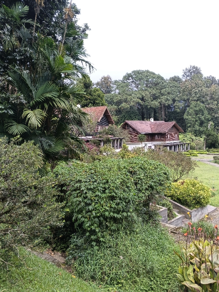 The image presents an elevated view of a landscaped estate in Kwekwe, Zimbabwe. Two distinct multi-story wooden structures with red tiled roofs are visible, surrounded by dense vegetation. The central building features a prominent white lower level with multiple supporting pillars, while a second, similar building is partially visible behind and to its left. The foreground is dominated by lush green foliage, including large palm fronds on the left and numerous shrubs and smaller trees. Concrete retaining walls or planter boxes are present in the immediate foreground, containing various plants, including some with orange-red flowers. In the background, a manicured lawn with discernible pathways and formal garden beds stretches towards a distant, dense treeline. The sky above is overcast. No individuals or active subjects are visible within the scene.
