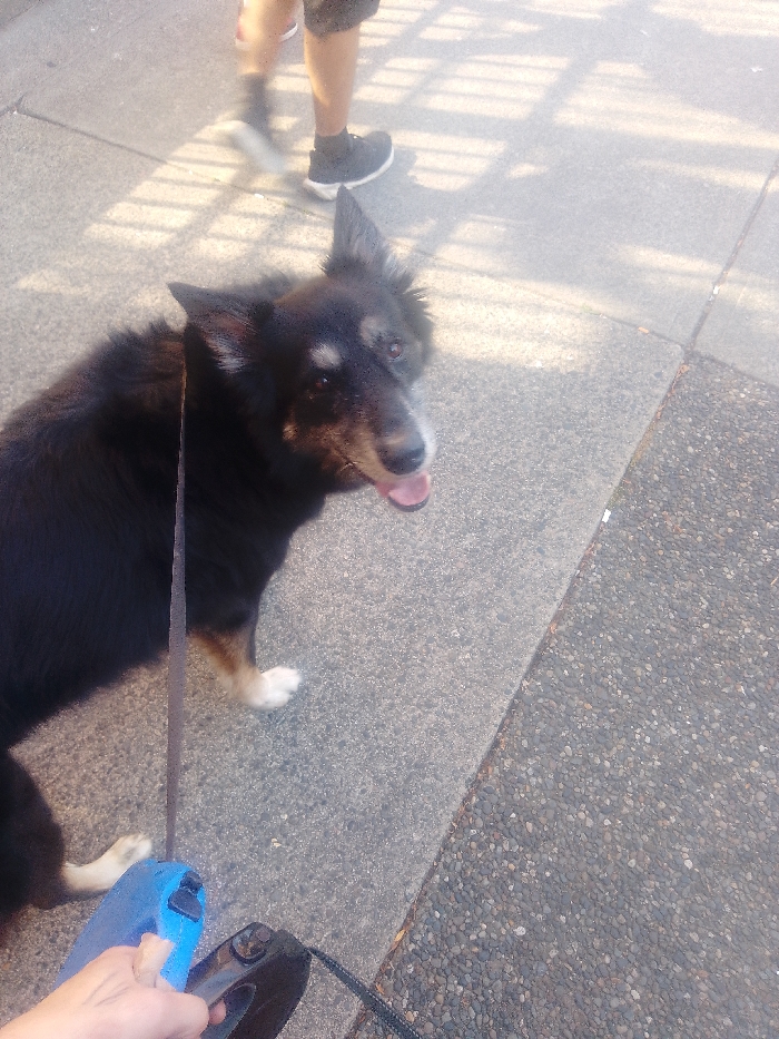 The image captures an outdoor scene on a paved surface, identified as a sidewalk in Vancouver, Canada. A medium-sized dog, primarily black with tan facial markings and one visible white front paw, is the central subject, looking towards the viewer with its mouth slightly open. The dog is attached to a dark-colored leash, which extends from a blue retractable leash handle held by a human hand visible in the lower-left foreground. In the upper background, the lower legs and feet of a second individual, wearing dark shoes and light shorts, are visible and appear to be in motion. The ground comprises two distinct paved sections: a lighter grey, uniformly textured concrete area to the left, and a darker, pebbled aggregate surface to the right, separated by a clear seam. Strong, directional sunlight illuminates the scene, casting prominent linear shadows onto the lighter paved section.