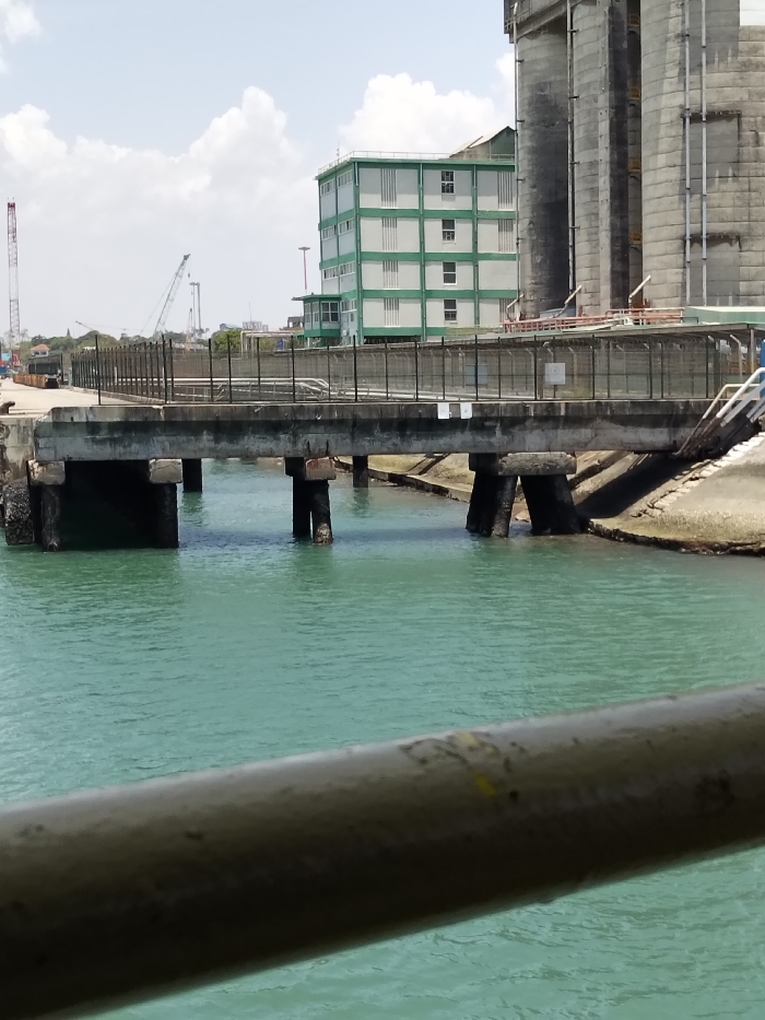 The image displays an industrial waterfront scene in Mkomani ward, Kenya, under a bright, partly cloudy sky. A blurred, dark grey metallic railing occupies the immediate foreground, running diagonally across the bottom. In the midground, a substantial concrete pier or walkway extends over calm, turquoise-green water. This structure is supported by multiple thick, weathered concrete pillars partially submerged. The surface of the pier features a dark metal fence running along its edge, behind which a flat, paved area is visible. To the right, an angled concrete embankment slopes down into the water, with a section of white and blue stairs visible ascending from it. The background reveals an industrial complex. A multi-story building with distinctive light green horizontal banding on white sections, interspersed with windows, stands directly behind the pier. To its right are several tall, grey, cylindrical concrete silos, characteristic of a bulk cargo facility. Further in the distance, multiple large industrial cranes, including one prominent red crane on the left and other lighter-colored cranes, are visible, indicating an active port environment. No individuals are present in the frame.