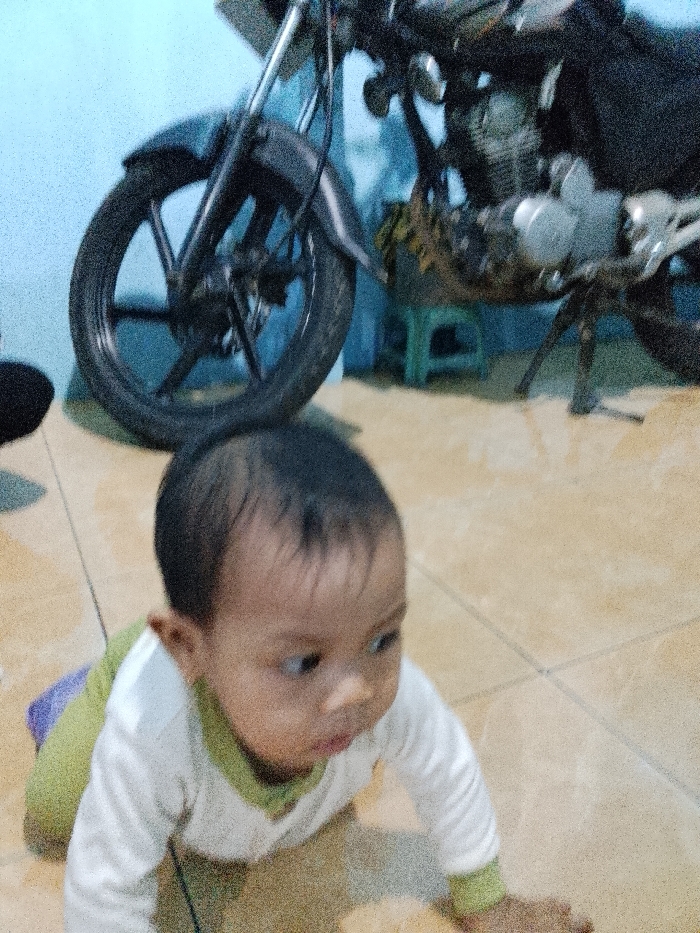 - "A grainy, low-light indoor photograph depicts an infant positioned on all fours, crawling, in Kecamatan Pati, Indonesia" by FM-BBWcp1, licensed under CC BY 4.0