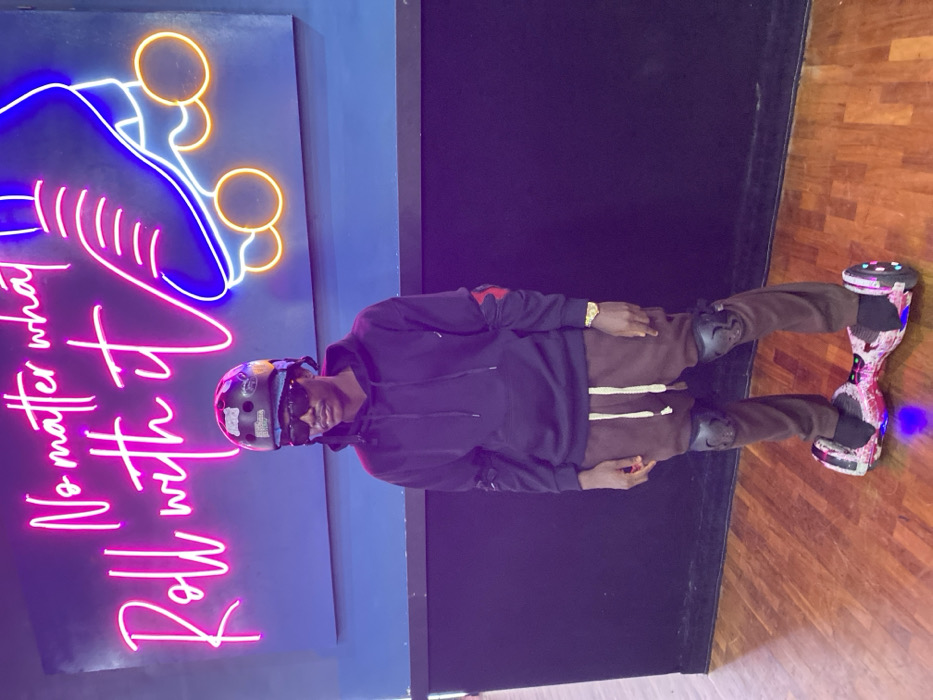 - "A male individual stands on a patterned hoverboard with blue underglow, wearing a dark grey helmet over a blue beanie, black sunglasses, a black hooded sweatshirt, brown sweatpants with light drawstrings, black knee pads, and black socks" by FM-rkm0j2, licensed under CC BY 4.0