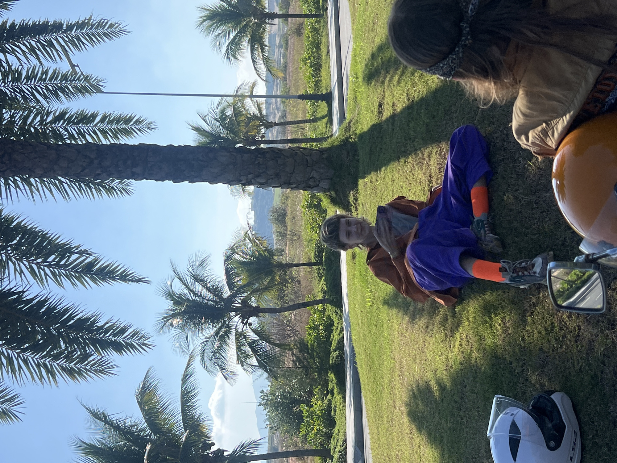 The image depicts two individuals resting outdoors in Cam Ranh, Vietnam, under a clear, bright sky. In the foreground, a person is seated cross-legged on a manicured grass lawn, wearing an orange top, purple pants, and bright orange socks with grey sneakers. This individual holds a small, folded item in their hands and looks directly towards the camera with a slight smile. To their left, a white "LS2" brand motorcycle helmet with a clear visor rests on the grass. Partially visible in the bottom right corner, a second person is seated with their back to the camera, characterized by long brown hair secured with a patterned bandana and wearing a tan jacket. An orange helmet is visible in the immediate foreground, suggesting they are on a motorcycle, part of which is indicated by a rearview mirror reflecting a road. The scene is populated by numerous palm trees, some casting long shadows across the grass. Behind the subjects, a paved road or pathway runs horizontally, beyond which lies a landscape of green shrubs, lighter vegetation, and distant hills or mountains under a light blue sky with scattered white clouds. A street light pole is also visible in the middle ground.