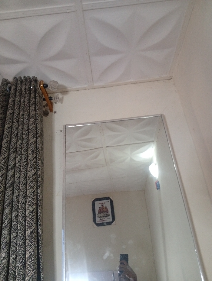 A framed mirror hangs on a beige wall, reflecting a patterned ceiling. To the left, patterned curtains are hung. The reflection also shows a framed picture on the wall and a portion of a person holding a phone. A light source is near the mirror's top. The ceiling consists of repeating geometric patterns.