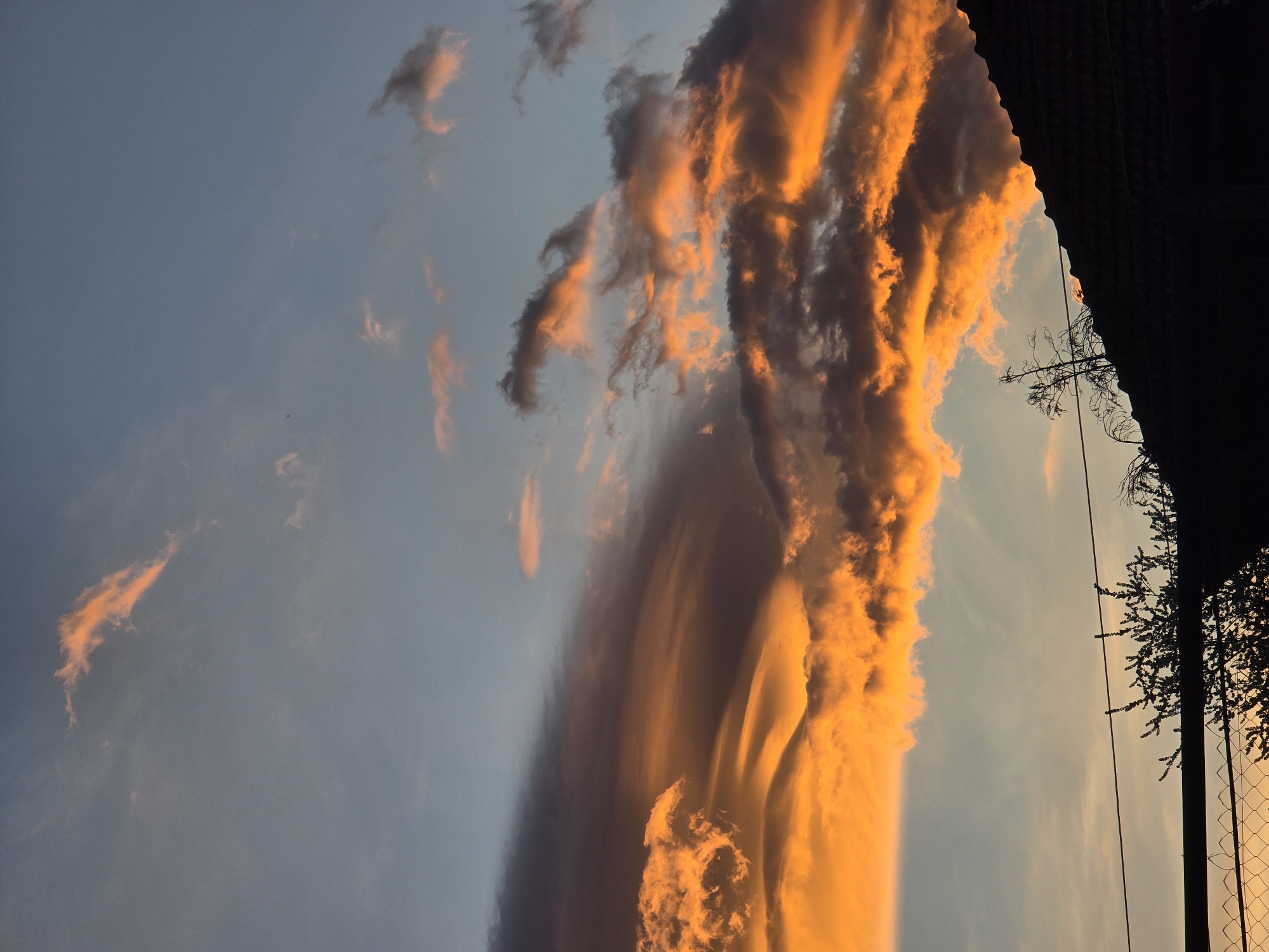 A vertically oriented photograph shows a colorful sunset in what may be Berkovitsa, Bulgaria. A large, linear cloud formation dominates the center and right portion of the image, transitioning from dark to bright orange as it is lit by the setting sun. To the left of the orange cloud is a gray-blue sky with sparse smaller clouds also catching the orange light. At the top right of the frame is the dark silhouette of a roof edge, with power lines and branches of a tree. Part of a chain-link fence is also visible on the lower right. The overall impression is of a dramatic and colorful sunset captured from a specific location where urban elements intersect with the natural landscape.