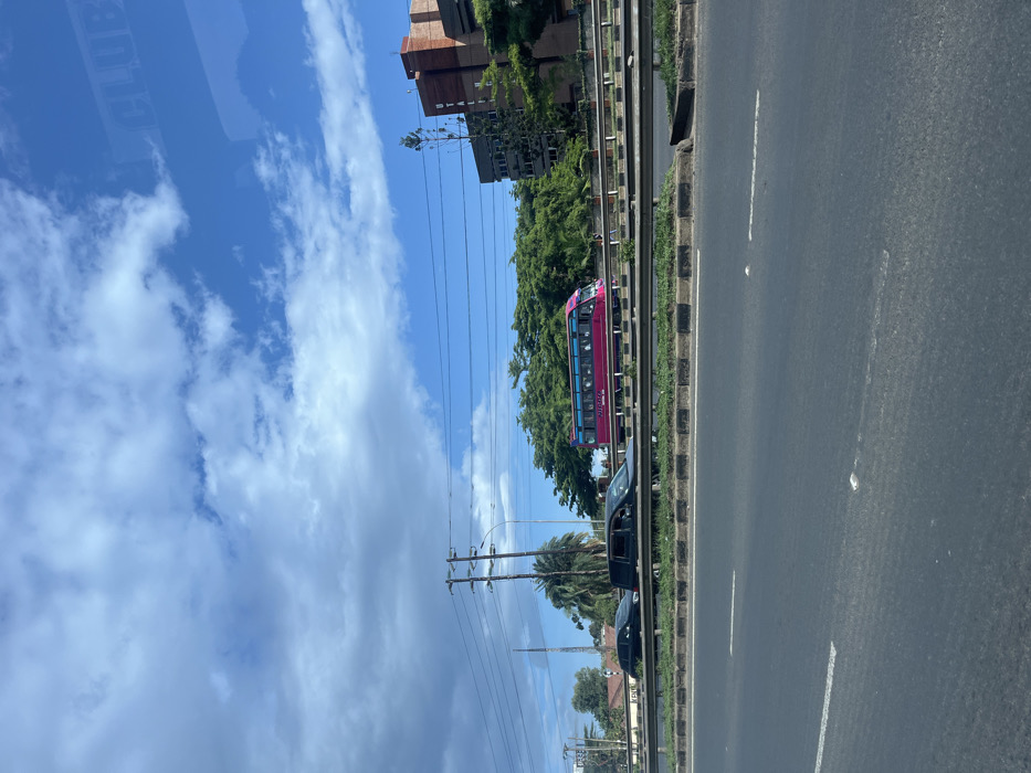 A bright day showcases a multi-lane road. A pink and blue double-decker bus travels alongside parked cars. Lush greenery lines the median, separating the road from a backdrop of buildings. Utility poles with wires stretch across the sky, partially obscured by puffy white clouds in a blue sky.