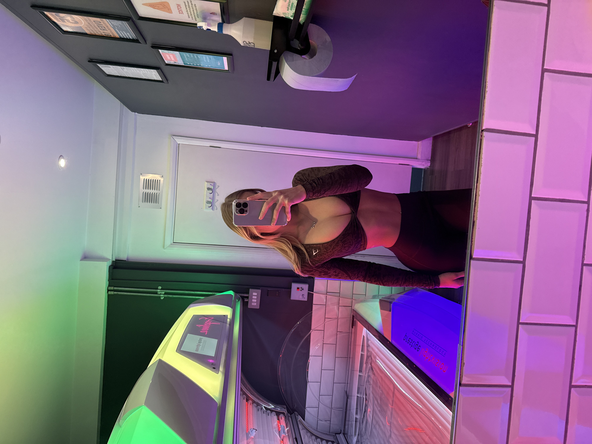 An individual is depicted taking a mirror selfie within a tanning room at a Blaze Tanning facility in Tunbridge Wells, United Kingdom. The subject, likely female, has long, light-colored hair and is wearing a dark, long-sleeved Gymshark crop top revealing the midriff and décolletage, paired with dark leggings. A silver necklace with an infinity symbol is visible. The person holds a silver-colored smartphone, partially obscuring the face, to capture the reflection. The room features a horizontal tanning bed, prominent on the left, with illuminated green and yellow panels on its upper section, red lights visible within its bed, and a blue-lit component beneath. A digital display on the tanning bed reads "no ordinary experience" and "blaze." The wall behind the tanning bed is tiled with white subway tiles. A control panel with multiple switches is mounted on the wall adjacent to the tanning bed. The right wall is dark grey, adorned with several framed notices, including one stating "OVER 18" and another "NOTICE" (both reversed due to the mirror reflection). A black shelf on this wall holds a roll of white paper, a white spray bottle, and green cleaning wipes. A white door is visible in the background, slightly ajar, leading to another area. The floor is covered with wooden laminate. The environment is illuminated by the tanning bed's colored lights (green, red, blue) and ambient room lighting, creating a multi-hued atmosphere.