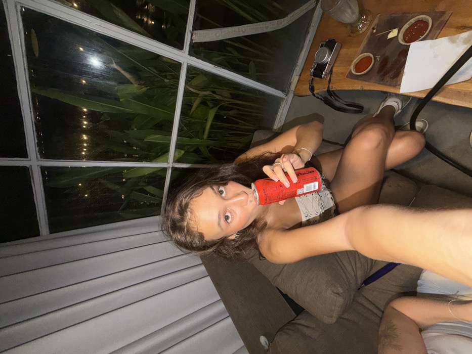 The image depicts an interior scene at night, featuring a young female individual seated on a brown upholstered sofa. She has dark hair and a visible nose piercing, wearing a light-colored, strapless top. Her left hand holds a red 'ROCKSTAR' energy drink can, from which she is drinking. Her right forearm extends towards the viewer, indicating she is operating the camera for a self-portrait. A portion of a second individual's leg is partially visible on the lower left, also seated on the sofa. To the right of the primary subject, a multi-paned window frames an exterior view of dense tropical foliage and blurred distant yellow lights against a dark, nocturnal sky. A dark wooden table in the foreground exhibits a silver compact camera with a black strap, a wooden serving board holding two small ceramic dishes containing red liquid, a white napkin, and a tall, clear glass. A black flexible hose, consistent with a hookah component, traverses the lower right section of the frame. The setting, characterized by tropical greenery and an informal lounge arrangement, is consistent with establishments found in Kuta, Indonesia.