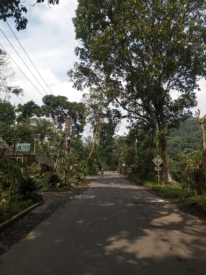 A paved road in Sandamal Eliya, Sri Lanka, extends into the distance, bordered by dense vegetation under a partly cloudy sky. The dark asphalt road surface displays patches of lighter material and dappled shadows from overhead trees. On the left side, a rustic structure with a natural roof is partially visible behind lush foliage, adjacent to a white sign with green lettering, partially decipherable as "ARU...". Three utility lines traverse the upper left portion of the sky. On the right side, a large, mature tree with a full green canopy and a textured trunk stands prominently. A utility pole with a streetlight and a white diamond-shaped road sign depicting a crossroads are positioned near the large tree. In the mid-distance on the road, a single individual is observed operating a small motorcycle, traveling away from the camera. The background features densely forested hills.