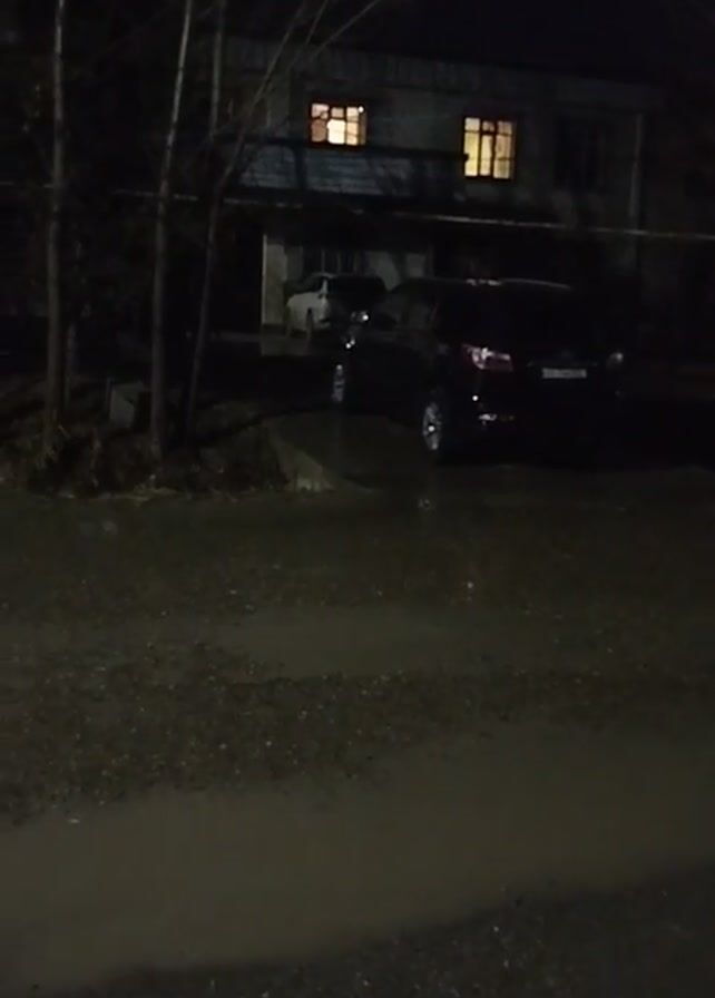 dark, wet outdoor scene at night. A muddy area with puddles is visible in the foreground. In the background, there are bare trees and a two-story building with lit windows. A dark SUV is parked in front of the building. The camera pans slightly to the right.