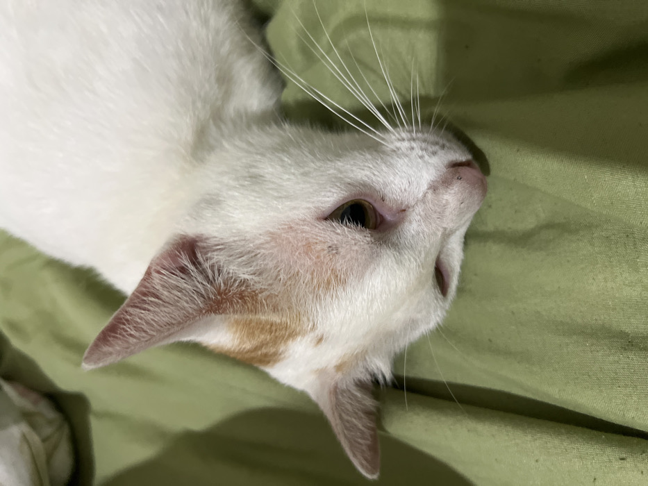 This image, originating from Cam Đức, Vietnam, presents a close-up, high-angle view of a domestic short-haired cat. The cat displays predominantly white fur with distinct orange-ginger markings on its ears and forehead. It is positioned lying on a wrinkled, light green fabric surface, consistent with bedding or a blanket. The cat's head is oriented downwards, and its amber-colored eyes are open, directed towards the lower-left portion of the frame. Long, white whiskers extend prominently from its muzzle. The cat's pinkish nose features small dark spots, and several minute dark specks are observable on its facial fur, notably around the eyes and forehead. Localized areas of mild erythema are visible on the skin above the right eye and at the base of the ears. There are no individuals present, and no active interactions are depicted; the cat appears to be in a state of rest within an indoor environment.