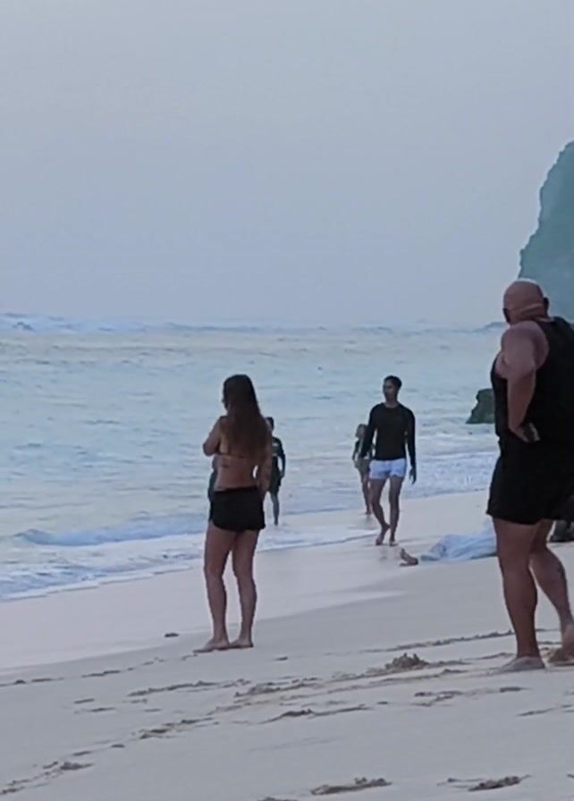 beach scene with several individuals. The ocean is visible with moderate waves. A woman with long hair, wearing dark shorts and facing away from the camera, is standing on the sand. A man in a dark long-sleeved shirt and light-colored shorts walks toward the camera. Another person, possibly a child, is standing in the shallow water. There's a woman sitting on the sand with her hair down. A large man in a black tank top and black shorts stands with his hands on his hips near the right side of the frame. The sky is overcast. A rocky cliff face is seen in the background on the right.